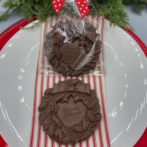 Beautifully detailed wreath in solid milk chocolate. Bagged and bowed for the perfect grab gift or stocking stuffer.